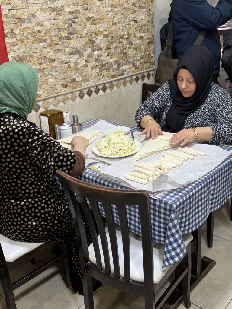 1. is a family restaurant where the women hand roll very thin film dough with a smear of cheese and onions and then deep fry it.