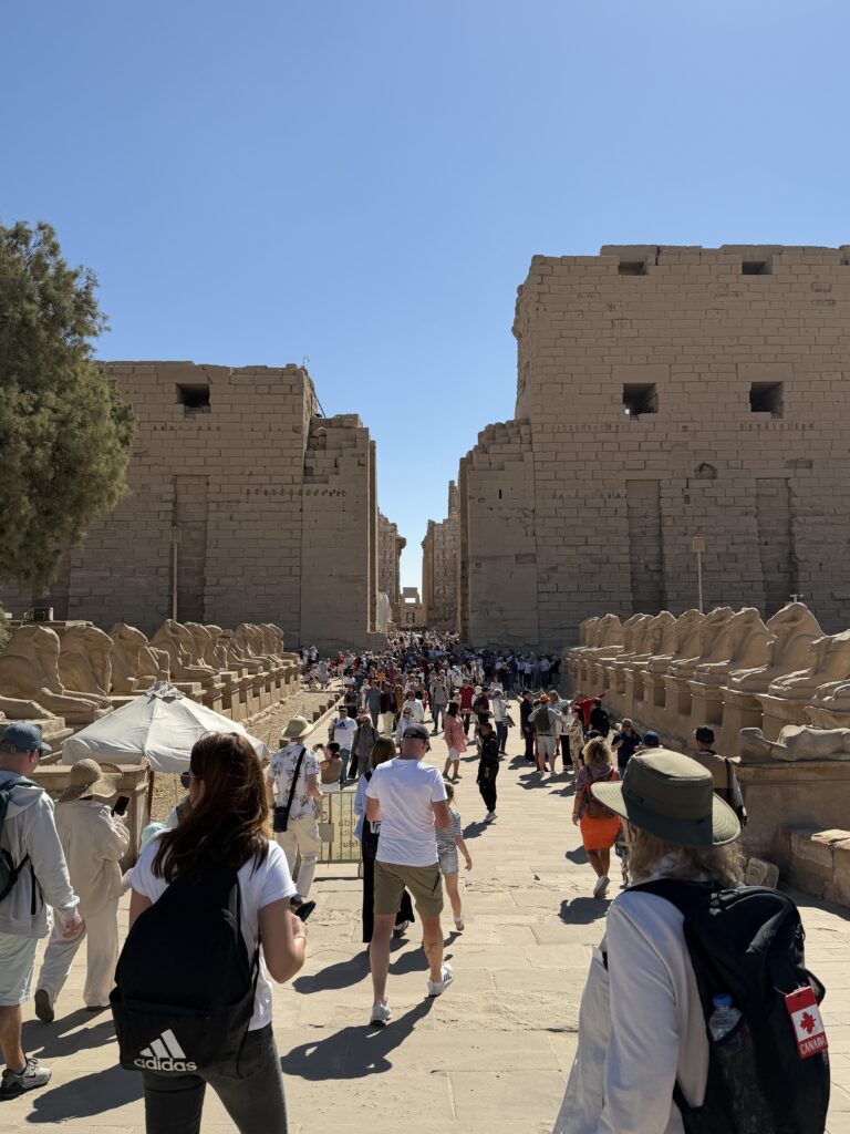 It is lined by a sphinx colonnade. The site was packed and the weather was in the 70s.