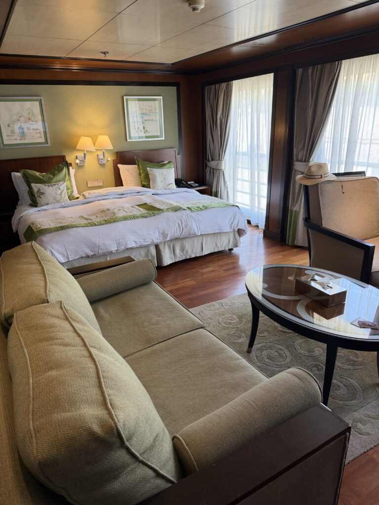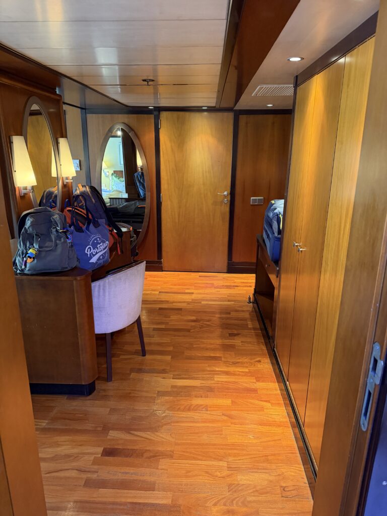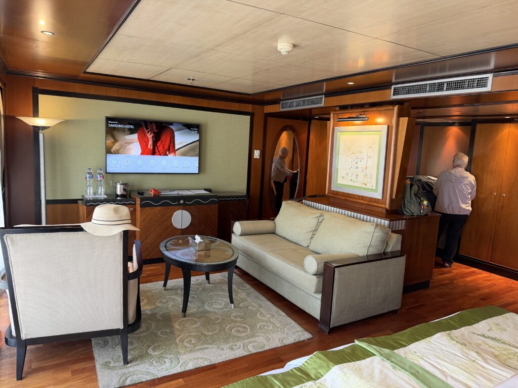 The sitting area and our entry way that has a desk, 2 large closets with shelves and a bathroom with a tub. Definitely more than comfortable and any other ship this would be considered a suite. The boats has 32 cabins so max of 64 passengers.