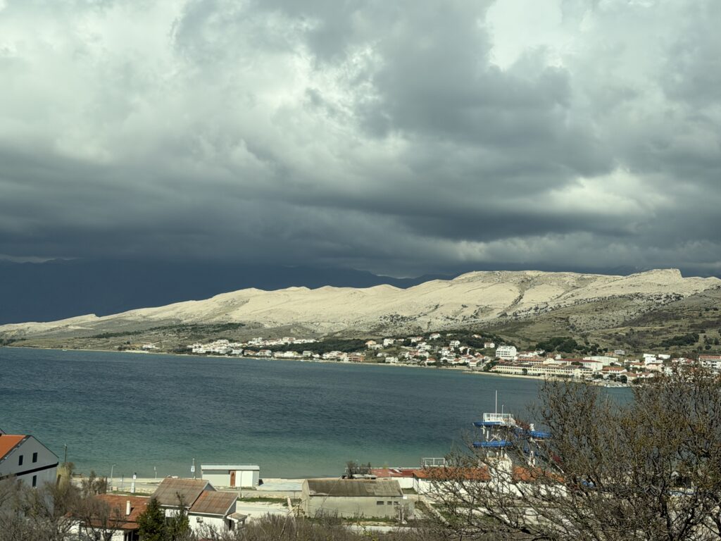 The island we were driving to is called Pag and is connected to the mainland by a bridge. In the summertime it is very active with lots of vacationers but right now not much is happening.