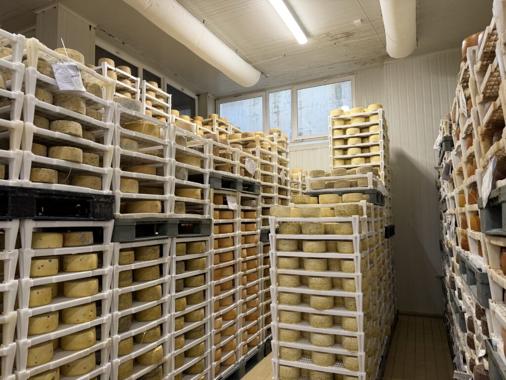 Racks of cheese aging and our cheese sample plate. The cheese was good, not great but good. Of course there was a gift shop on your way out that had olive oil, cheese and wine. We did not buy anything.